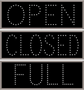 This TCL Series OPEN | CLOSED | FULL outdoor, blank-out sign is designed with super bright LEDs and a contrasting face; we guarantee it's readable in direct sunlight. The sign message is formed by visible LEDs on a black sign face and is designed to illuminate the message(s) when turned on and blank out or extinguish the message when off.