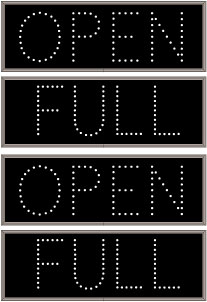 This TCL Series OPEN | FULL | OPEN | FULL (120-277VAC) outdoor, blank-out sign is designed with super bright LEDs and a contrasting face; we guarantee it's readable in direct sunlight. The sign message is formed by visible LEDs on a black sign face and is designed to illuminate the message(s) when turned on and blank out or extinguish the message when off.