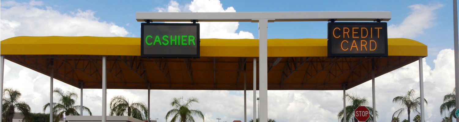 Illuminated cashier lane signs help avoid confusion by directing motorists to the correct payment lane, clearly displaying which lanes only accept cash, credit, parking permits, or monthly passes.