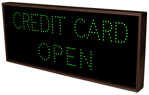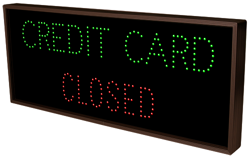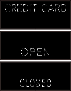 This TCL Series CREDIT CARD | OPEN | CLOSED (120-277VAC) outdoor, blank-out sign is designed with super bright LEDs and a contrasting face; we guarantee it's readable in direct sunlight. The sign message is formed by visible LEDs on a black sign face and is designed to illuminate the message(s) when turned on and blank out or extinguish the message when off.