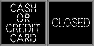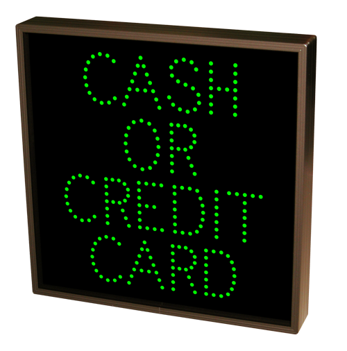 This TCL Series CASH OR CREDIT CARD | CLOSED (120-277VAC) outdoor, blank-out sign is designed with super bright LEDs and a contrasting face; we guarantee it's readable in direct sunlight. The sign message is formed by visible LEDs on a black sign face and is designed to illuminate the message(s) when turned on and blank out or extinguish the message when off.