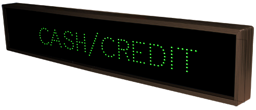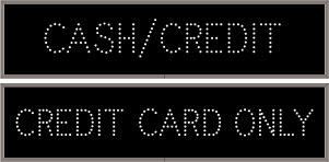 This TCL Series CASH/CREDIT | CREDIT CARD ONLY outdoor, blank-out sign is designed with super bright LEDs and a contrasting face; we guarantee it's readable in direct sunlight. The sign message is formed by visible LEDs on a black sign face and is designed to illuminate the message(s) when turned on and blank out or extinguish the message when off.
