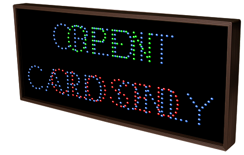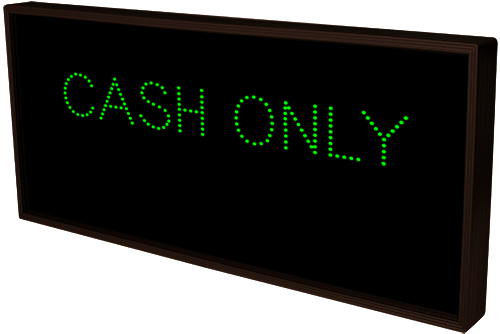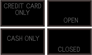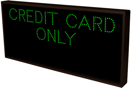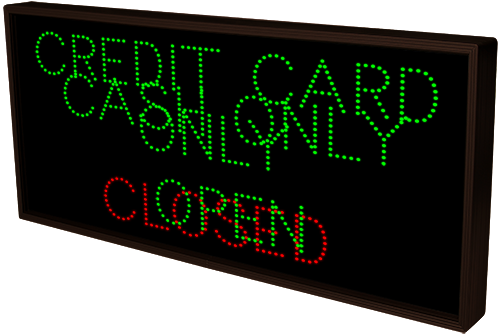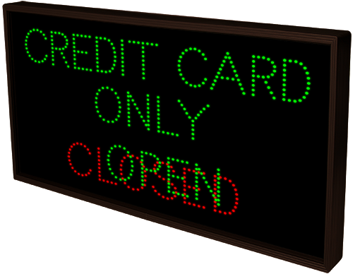 This TCL Series CREDIT CARD ONLY | CASH ONLY | OPEN | CLOSED (120-277VAC) outdoor, blank-out sign is designed with super bright LEDs and a contrasting face; we guarantee it's readable in direct sunlight. The sign message is formed by visible LEDs on a black sign face and is designed to illuminate the message(s) when turned on and blank out or extinguish the message when off.