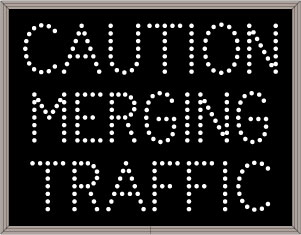 This TCL Series CAUTION MERGING TRAFFIC (120-277VAC) outdoor, blank-out sign is designed with super bright LEDs and a contrasting face; we guarantee it's readable in direct sunlight. The sign message is formed by visible LEDs on a black sign face and is designed to illuminate the message(s) when turned on and blank out or extinguish the message when off.