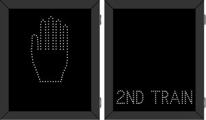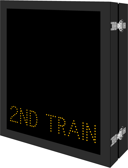 This DOT Series Hand Symbol | 2ND TRAIN sign is a direct-view LED design that illuminates red or amber when activated and blanks out when deactivated. Outside cabinet dimensions are 35.000" x 29.000" x 6.500".