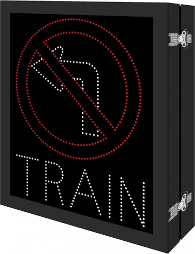 This DOT Series R3-2 No Left Turn Symbol w/ Train sign is a direct-view LED design that illuminates when activated and blanks out when deactivated. Outside cabinet dimensions are 35.000" x 29.000" x 6.500".