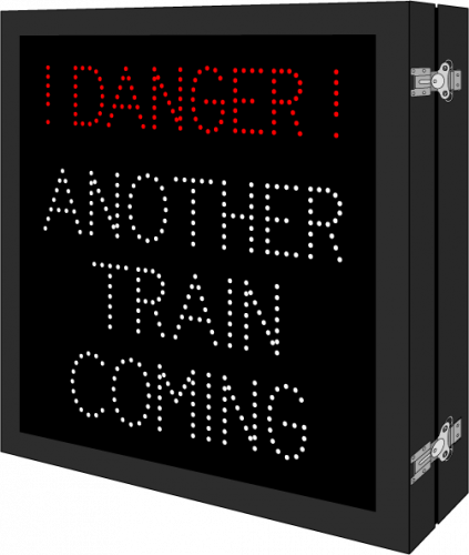 This DOT Series ! DANGER ! | ANOTHER TRAIN COMING sign is a direct-view LED design that illuminates red and white when activated and blanks out when deactivated.