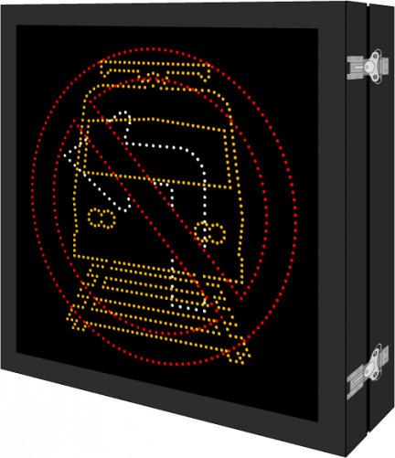 This DOT Series R3-2 No Left Turn Symbol | Light Rail Symbol sign is a direct-view LED design that illuminates when activated and blanks out when deactivated. Outside cabinet dimensions are 35.000" x 35.000" x 6.500".