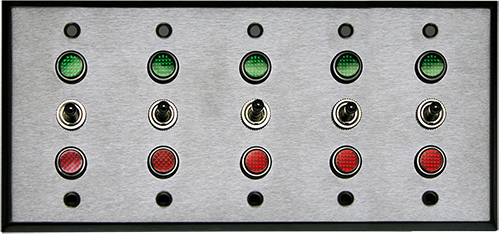 Five Gang Switch assembly with indicator lights and brushed, stainless-steel cover plate. (5) 3-position SPDT On/Off/On switch(es). Electrical box not included. Voltage: 120VAC