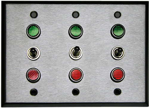Three Gang Switch assembly with indicator lights and brushed, stainless-steel cover plate. (3) 3-position SPDT On/Off/On switch(es). Electrical box not included. Voltage: 12VDC