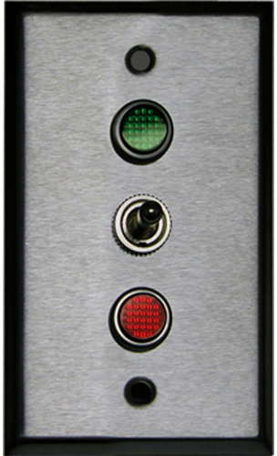 Single Gang Switch assembly with indicator lights and brushed, stainless-steel cover plate. (1) 3-position DPDT On/Off/On switch(es). Electrical box not included. Voltage: 120VAC