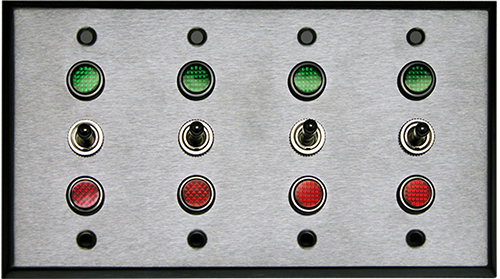 Four Gang Switch assembly with indicator lights and brushed, stainless-steel cover plate. (4) 3-position SPDT On/Off/On switch(es). Electrical box not included. Voltage: 12VDC.
