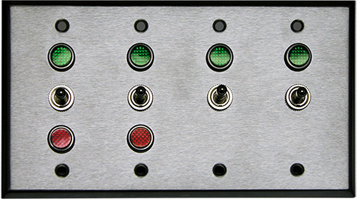 Four Gang Switch assembly with indicator lights and brushed, stainless-steel cover plate. (2) 2-position SPST On/Off switch(es) and (2) 3-position SPDT On/Off/On switch(es). Electrical box not included. Voltage: 120VAC