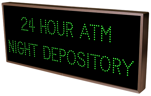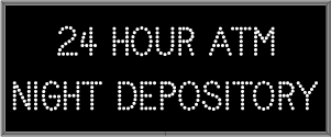 This TCL Series 24 HOUR ATM NIGHT DEPOSITORY outdoor, blank-out sign is designed with super bright LEDs and a contrasting face; we guarantee it's readable in direct sunlight. The sign message is formed by visible LEDs on a black sign face and is designed to illuminate the message(s) when turned on and blank out or extinguish the message when off.