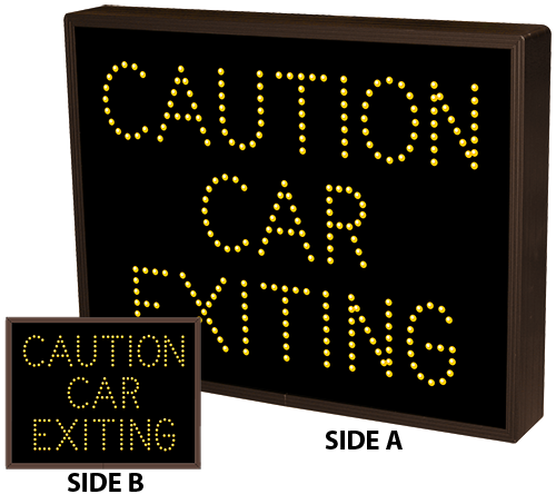 This TCL Series CAUTION CAR EXITING (120-277VAC) outdoor, blank-out sign is designed with super bright LEDs and a contrasting face; we guarantee it's readable in direct sunlight. The sign message is formed by visible LEDs on a black sign face and is designed to illuminate the message(s) when turned on and blank out or extinguish the message when off.