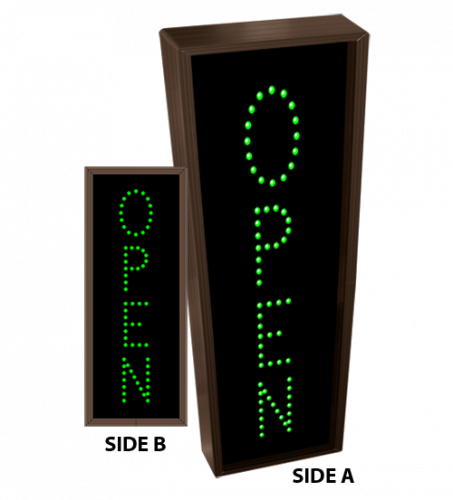 This TCL Series OPEN | OPEN outdoor, blank-out sign is designed with super bright LEDs and a contrasting face; we guarantee it's readable in direct sunlight. The sign message is formed by visible LEDs on a black sign face and is designed to illuminate the message(s) when turned on and blank out or extinguish the message when off.