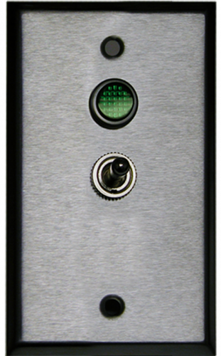Single Gang Switch assembly with indicator lights and brushed, stainless-steel cover plate. (1) 2-position SPST On/Off switch(es). Electrical box not included. Voltage: 24VDC