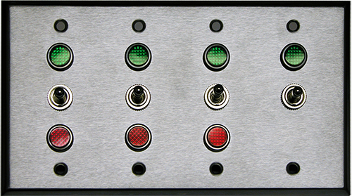 Four Gang Switch assembly with indicator lights and brushed, stainless-steel cover plate. (1) 2-position SPST On/Off switch(es) and (3) 3-position SPDT On/Off/On switch(es). Electrical box not included. Voltage: 120VAC