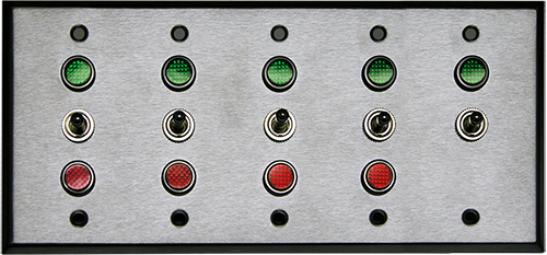 Five Gang Switch assembly with indicator lights and brushed, stainless-steel cover plate. (1) 2-position SPST On/Off switch(es) and (4) 3-position SPDT On/Off/On switch(es). Electrical box not included. Voltage: 120VAC