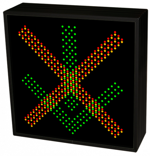 This STR Series X | X | Down Arrow outdoor, highway-grade blank-out sign is designed with a NEMA 3R cabinet, super bright LEDs and a contrasting face; guaranteed readable in direct sunlight. The sign message is formed by strategically placed visible LEDs on a black sign face and is designed to illuminate the message or messages when turned on and blank-out or extinguish the message when off.