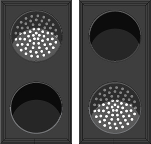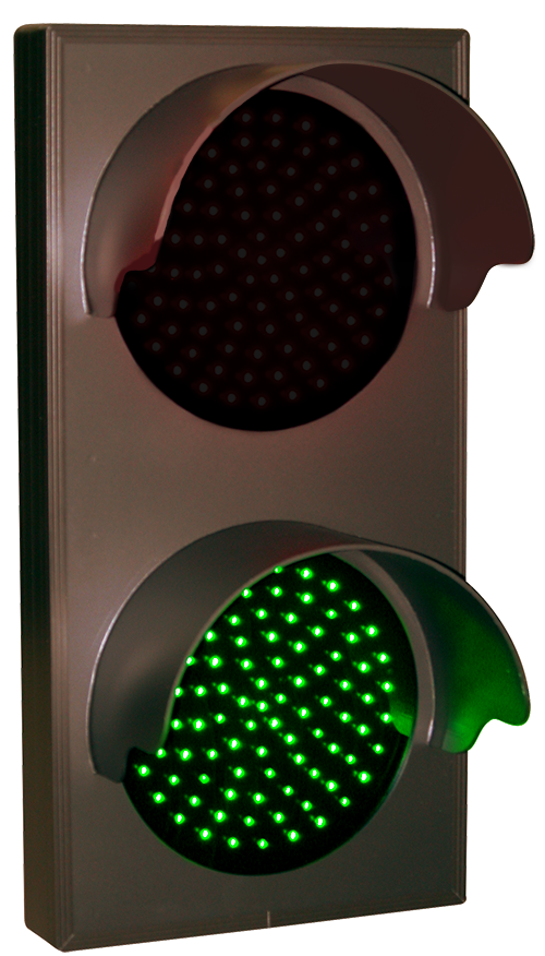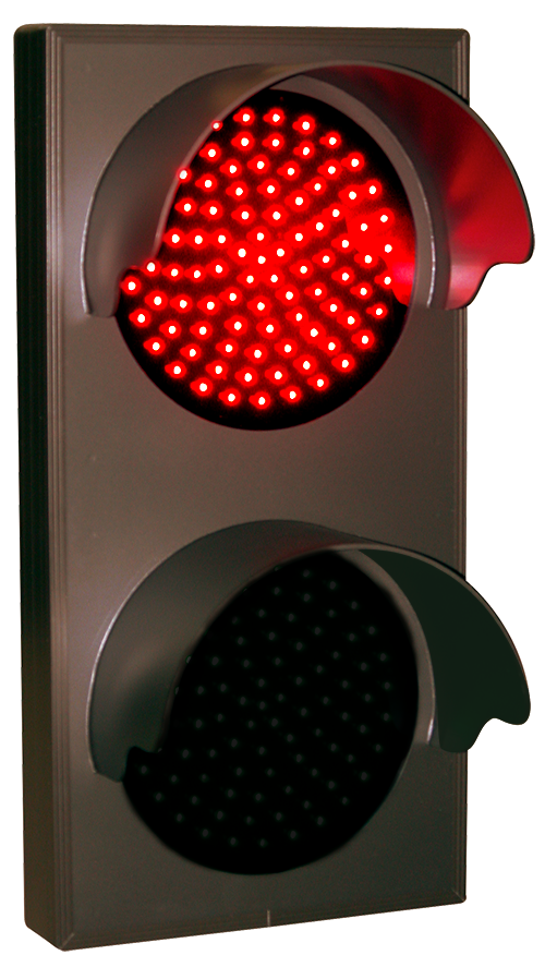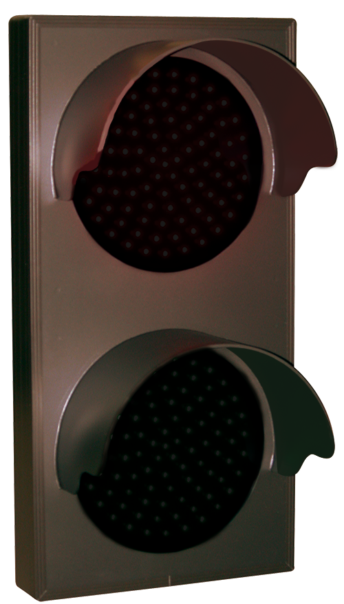 This TCL Series Indicator Dot, Double with Hoods, vertical, 4 in dia, Red - Green outdoor, blank-out sign is designed with super bright LEDs and a contrasting face; we guarantee it's readable in direct sunlight. The sign message is formed by visible LEDs on a black sign face and is designed to illuminate the message(s) when turned on and blank out or extinguish the message when off.