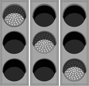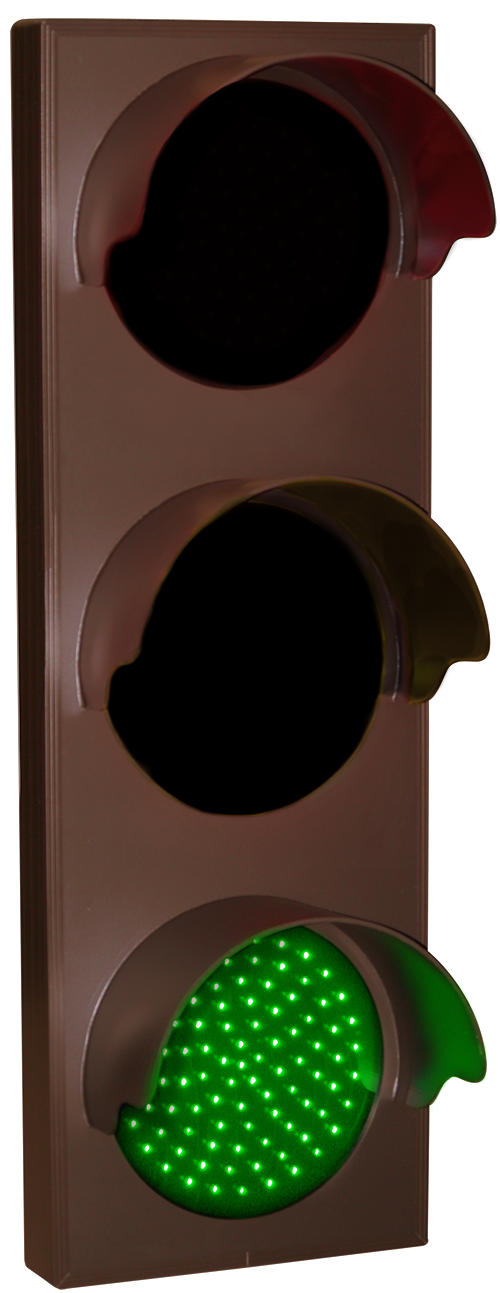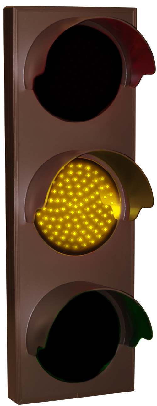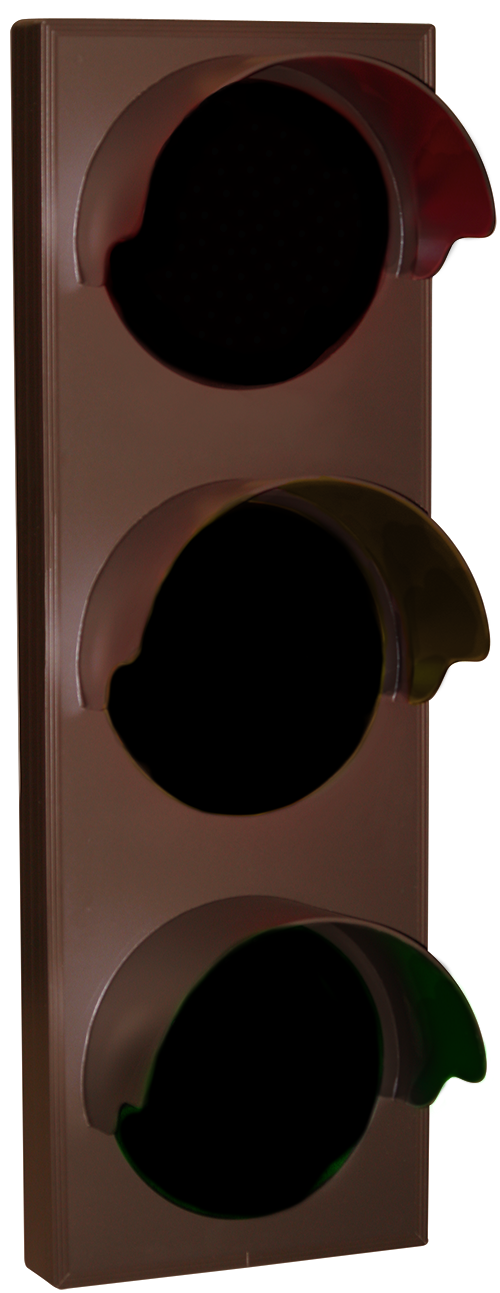This TCL Series Indicator Dots, Triple with Hoods, Vertical, 4 in dia, Red - Amber - Green outdoor, blank-out sign is designed with super bright LEDs and a contrasting face; we guarantee it's readable in direct sunlight. The sign message is formed by visible LEDs on a black sign face and is designed to illuminate the message(s) when turned on and blank out or extinguish the message when off.