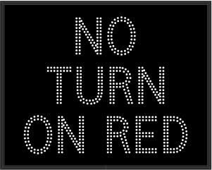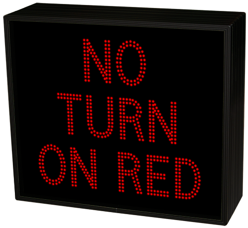 This STR Series NO TURN ON RED (120-277VAC) outdoor, highway-grade blank-out sign is designed with a NEMA 3R cabinet, super bright LEDs and a contrasting face; guaranteed readable in direct sunlight. The sign message is formed by strategically placed visible LEDs on a black sign face and is designed to illuminate the message or messages when turned on and blank-out or extinguish the message when off.