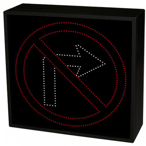 This STR Series No Right Turn outdoor, highway-grade blank-out sign is designed with a NEMA 3R cabinet, super bright LEDs and a contrasting face; guaranteed readable in direct sunlight. The sign message is formed by strategically placed visible LEDs on a black sign face and is designed to illuminate the message or messages when turned on and blank-out or extinguish the message when off.