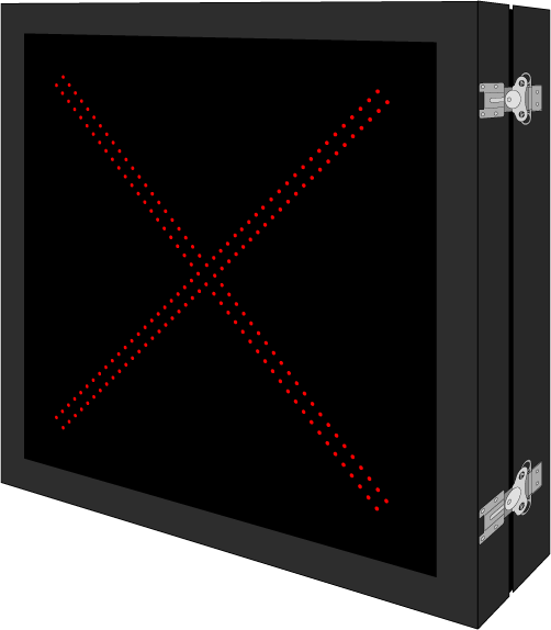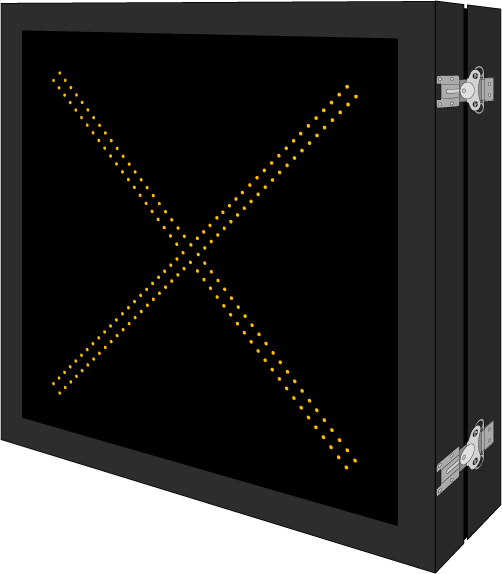 This DOT Series Center Lane Veering Arrows | Down Arrow | X | X sign is a direct-view LED design that illuminates white, green, red, or amber when activated and blanks out when deactivated. Outside cabinet dimensions are 38.000" x 38.000" x 6.500".