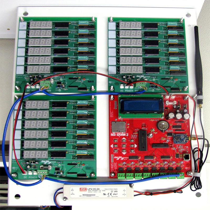 Super Master Control CenterThis is the central control point for the entire RedStorm Parking Guidance System. The SuperMaster Control Center gathers the vehicle count data from each transition point, updates the zone counts, logs important statistics, controls communication sequencing, and communicates the vehicle count information to all system signs in real-time. The Control Center typically consists of one SuperMaster Controller, one to multiple Auxiliary Displays for viewing sign counts remotely and one 120 Volt Power Supply. Components are mounted on a panel and enclosed in a 24" sq. NEMA 4X rated enclosure. We recommend placing it in a controlled area to prevent unauthorized access to the system controls. |
