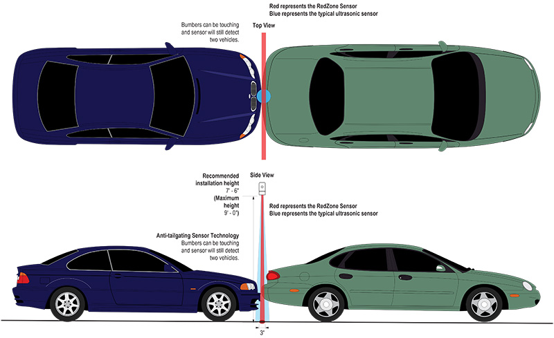 RedZone™ Infrared Overhead SensorRedStorm 2.0 uses infrared sensing technology as the standard approach to vehicle detection. It can also interface with other sensing technologies that provide a dry contact relay, such as inductance loops or gate operation (supplied by others). Redzone Infrared Sensors support unidirectional and bidirectional traffic flow. They are installed in pairs at each transition point to detect vehicles and their travel direction. Their sensing overlap has the ability to filter pedestrian traffic and their narrow 3" deep sensing zone prevents tailgating miss-counts. |